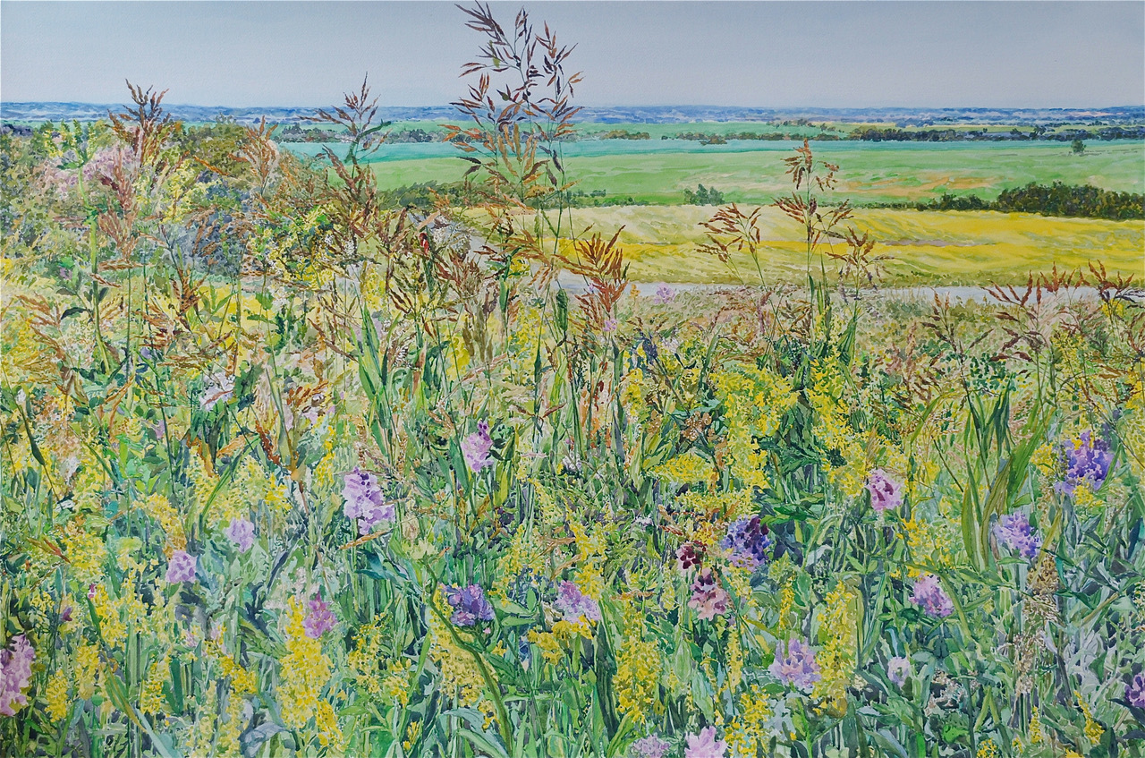 This watercolour is of a view from a height of land facing west. Looking through the foreground flowers and grass one sees the canola fields also known as prairie gold. In the distance is the riverbank of the South Saskatchewan. This area is near the national historic sight of Batoche where one of the famous battles of the Louis Riel Rebellion took place. In July this area of Saskatchewan is at its most beautiful with many vibrant colours of flax, canola, and wheat fields growing under the clear sunny skies.